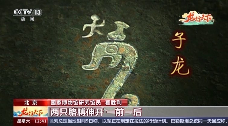 国家博物馆研究馆员 翟胜利:子龙鼎因为它的器内的“子龙”二字的铭文而得名。“子”字比较小,是单线阴刻,而“龙”字体量比较大,是阴线双勾,像个小孩子一样,两只胳膊伸开一前一后,好像在奔走。子龙鼎的铭文,代表了商周时期比较典型的文饰和文字风格,这是我们目前能够见到的青铜圆鼎上最早的“龙”字。