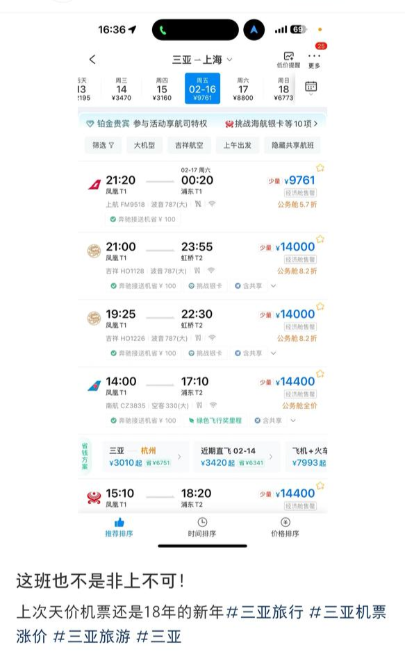春节假期过半,许多人还沉浸在假期的快乐中。然而,不少在三亚过春节的游客,已经开始焦虑了,因为没有提前买三亚回程机票,可机票价格一路暴涨,有的已经突破万元。