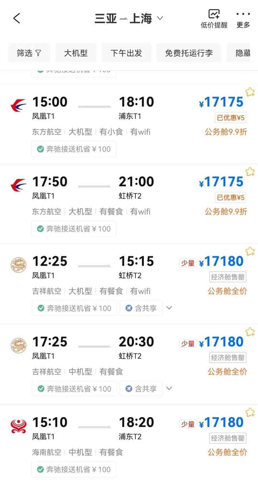 2月13日上午,记者在携程旅行搜索注意到,目前三亚回程机票价格确实在暴涨。以三亚飞上海为例,2月14日-15日,只剩少量的全价经济舱机票,价格在3500元左右。公务舱的价格从8000元至17000元不等。2月16日-17日,经济舱的机票几乎全部售罄,公务舱的价格均在14000元以上。