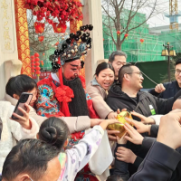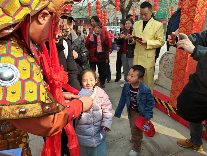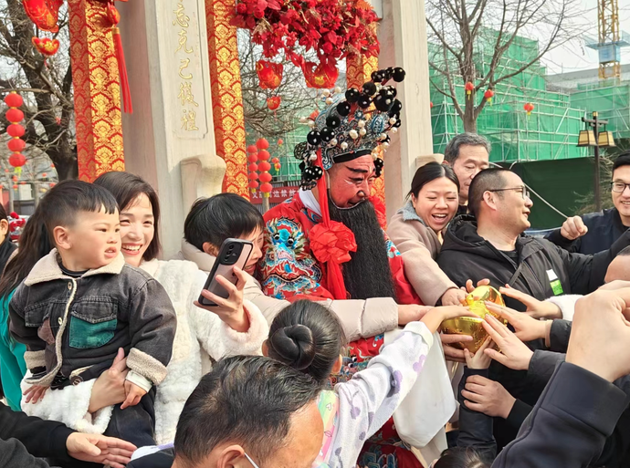 “祝大家龙年行大运、龙年发大财!”这边舞狮表演刚结束,棂星门下就走出来两个“财神”,他俩抱着金色的“大元宝”,一句句祝福吸引群众纷纷前来合影。不一会儿,财神的元宝就被传递在现场观众的手中,传财运、迎新春、拍合影,场面一度十分热闹。