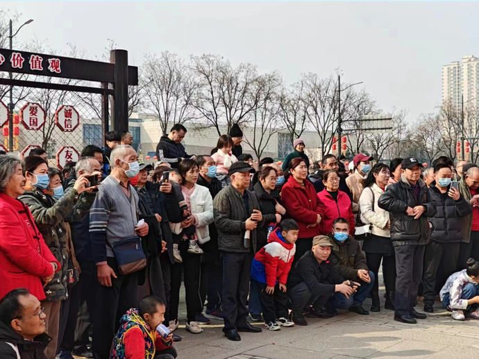 在豫剧“抬花轿”的唱腔吸引下,人们围在了“龙门”附近,“金鳞化龙”的“戴龙帽”活动正式开始了。“我属龙,我来!”在主持人的引导下,五名现场随机挑选的“龙阿姨”“龙叔叔”“龙宝宝”们纷纷走上台前,为大家送上了龙年的新春祝福。