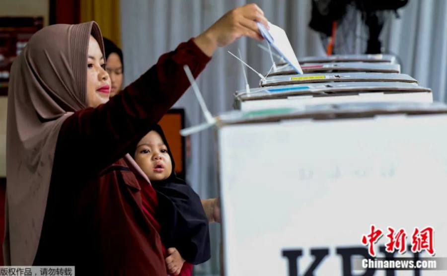 2024年2月14日,印度尼西亚西爪哇省,印尼举行总统选举投票,一名妇女在一处投票站投票。