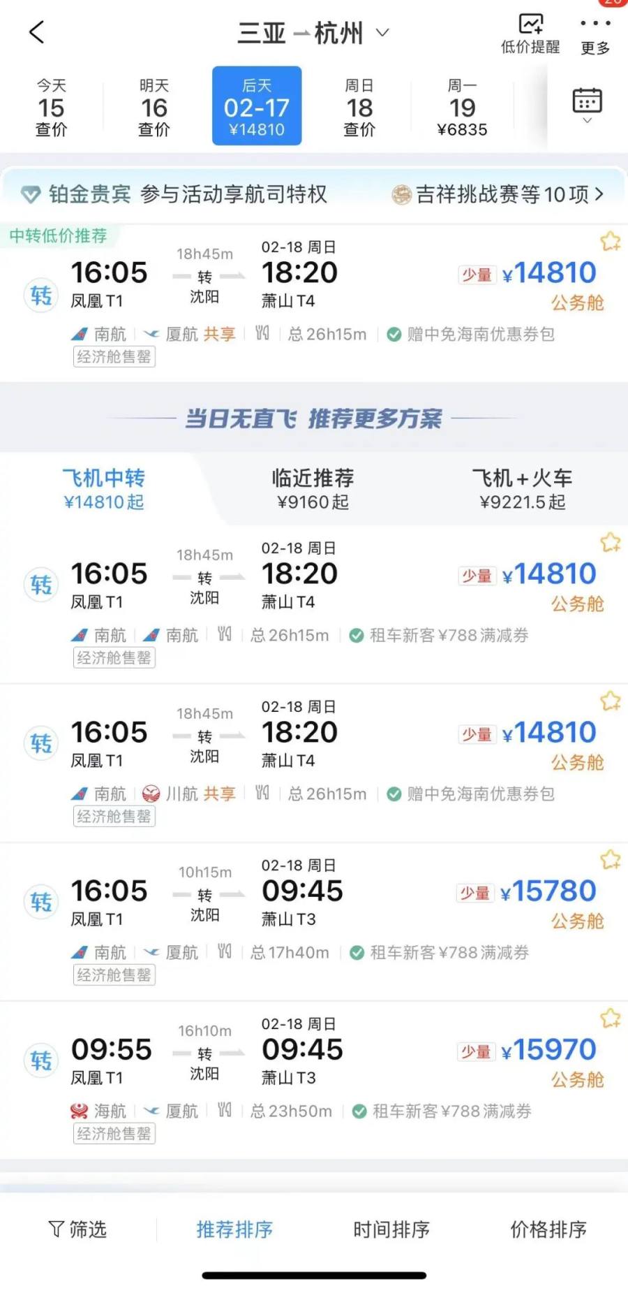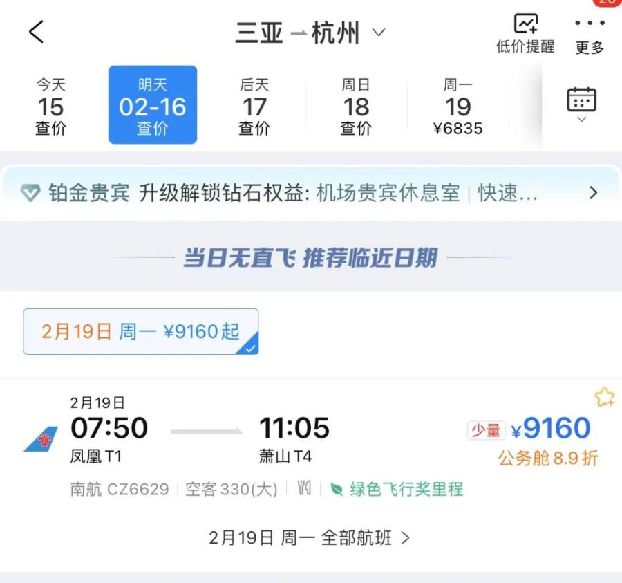 15日,记者查询发现目前三亚回程机票价格确实较贵。以三亚飞杭州为例,2月16日-17日,只剩少量公务舱还有票,或是通过转机,要花费10多个小时,价格在14000元以上。