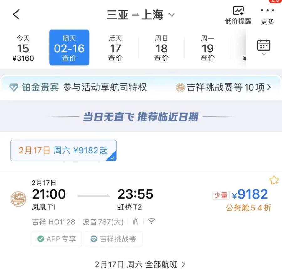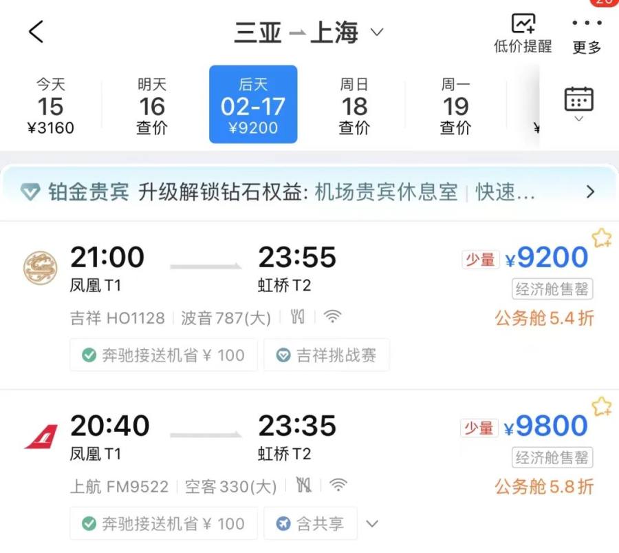 2月16日-2月17日,三亚飞上海,经济舱也已售罄,公务舱仅剩少量余票,价格也在近万元。