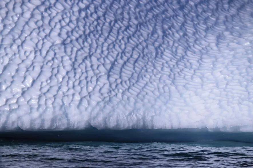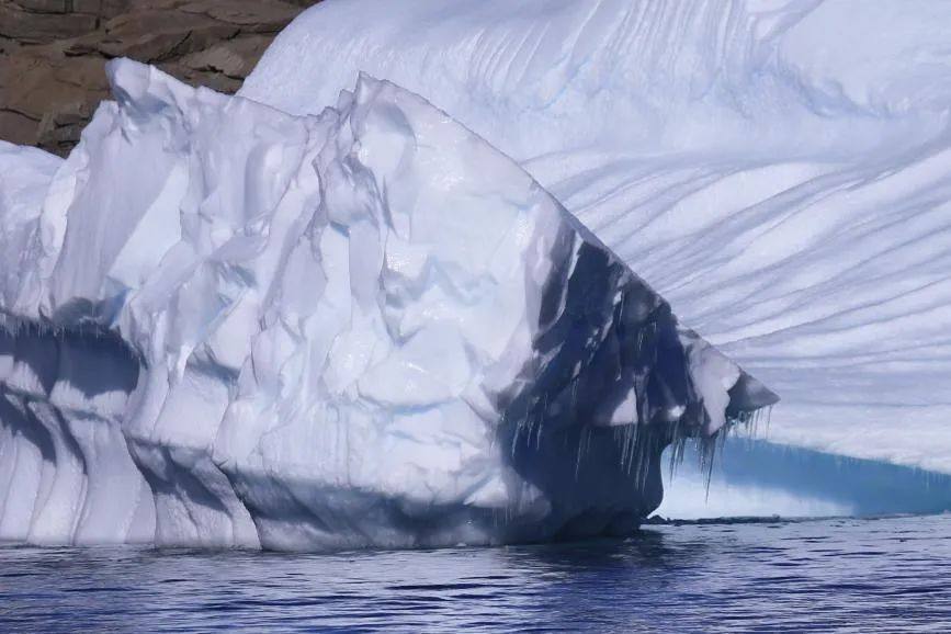 在社交媒体上,肥鹅分享了一组摄影作品,名为“冰川的肌理”。漫长的时光里,碎块于冰山脱落,落在海洋中。经过风吹日晒,以及海浪的剥蚀,便雕琢出不同走向的纹路。“我们会坐着皮划艇,在冰川之间穿梭,距离可能只有一米。肉眼看非常壮观,那一刻会让人非常敬畏自然。”