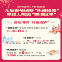 2月16日,支付宝公布春节数据报告显示,龙年春节各地涌现“特色经济”、年货直播出现流量“新风口”、出入境游双向升温。