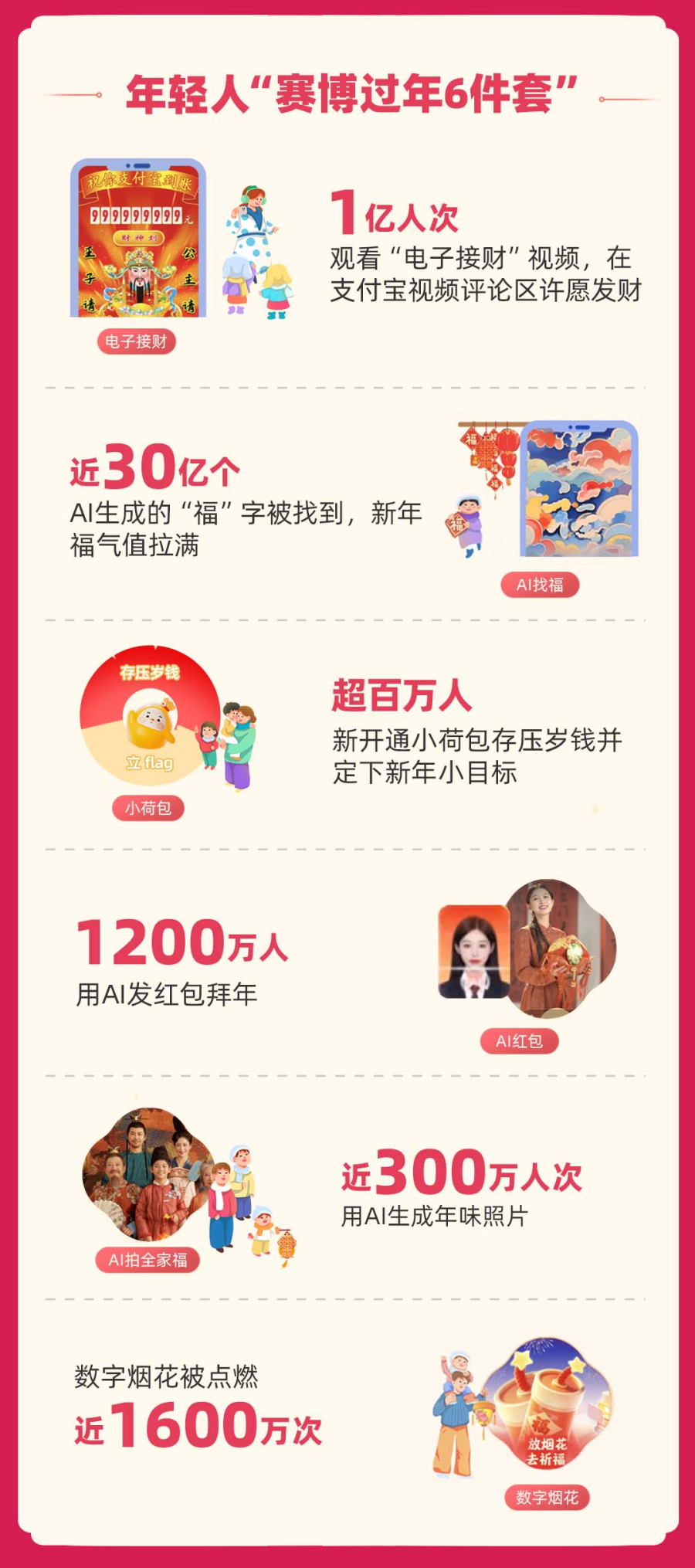 其中,有1亿人次涌入支付宝围观“接财”视频。大年初五当天,还有大批年轻人上支付宝“赛博接财神”。在刚刚结束的支付宝集五福活动中,“大家来找福”也成为今年最受欢迎的集福卡方式,共有近30亿个AI生成的“福”字被找到。