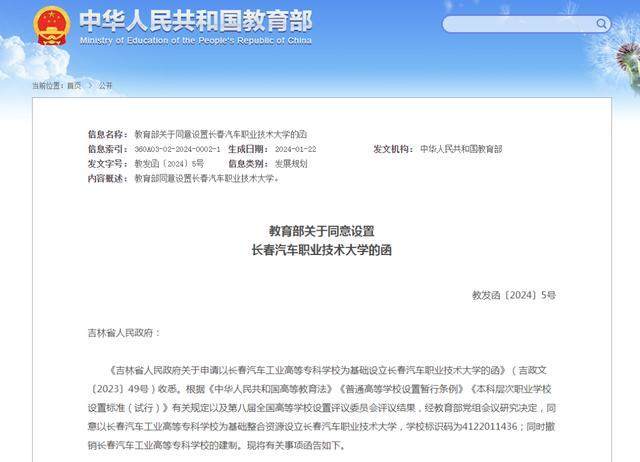 近日教育部网站发布《教育部关于同意设置长春汽车职业技术大学的函》。