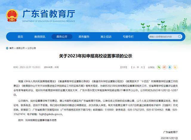 2023年12月1日,广东省教育厅官网发布“关于2023年拟申报高校设置事项的公示”,拟向教育部申报设置大湾区大学。