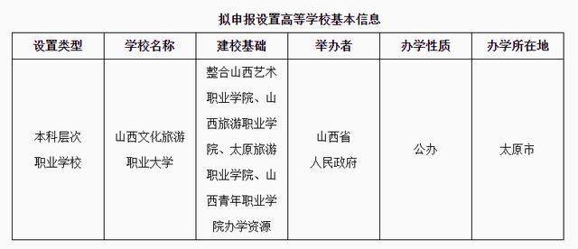 山西文化旅游职业大学将整合山西艺术职业学院、山西旅游职业学院、太原旅游职业学院、山西青年职业学院四所高校的办学资源,设置本科层次职业学校“山西文化旅游职业大学”。