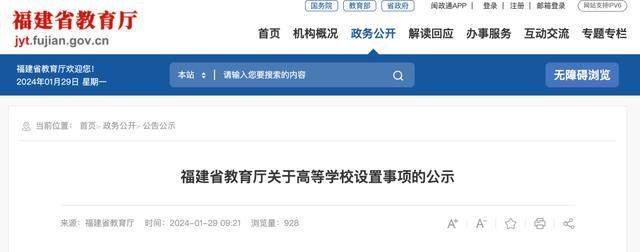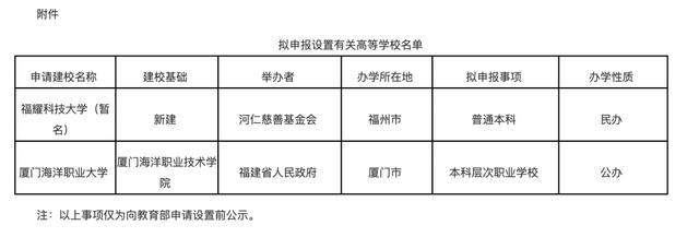 1月29日,福建省教育厅发布关于高等学校设置事项的公示,拟向教育部申报设立福耀科技大学(暂名)等2个事项予以公示。