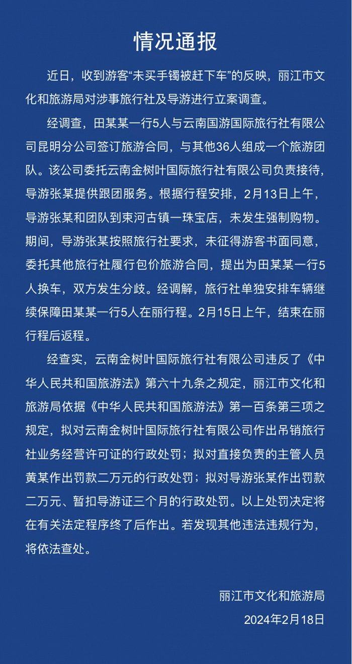 游客未买手镯被赶下车?丽江涉事旅行社、导游被罚