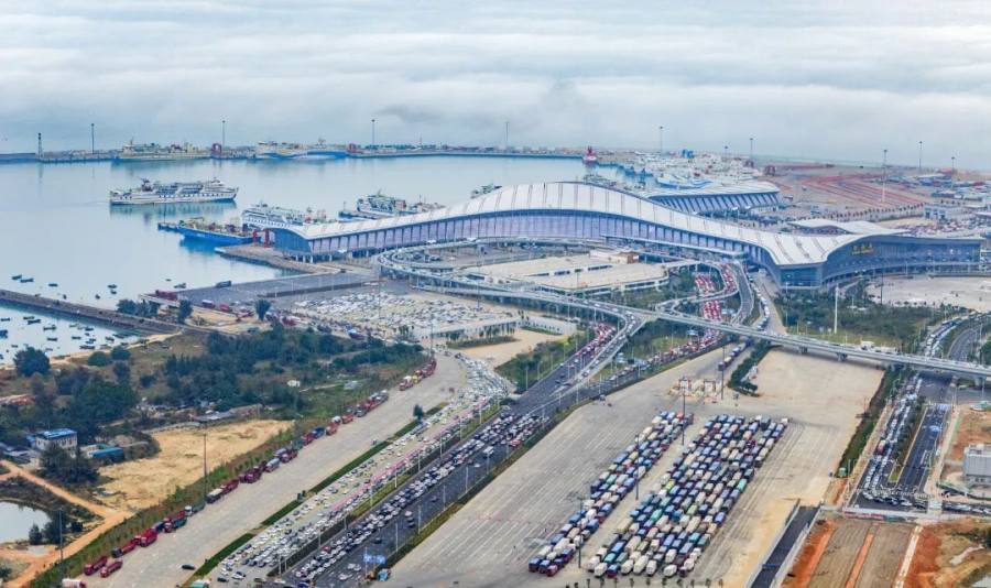△2月16日,海口新海客运综合枢纽,自驾车辆正在有序排队登船。