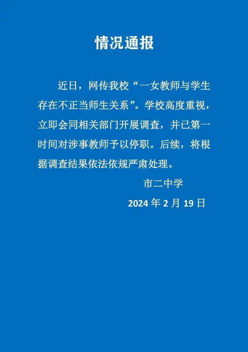 19日下午,上海市第二中学发布相关情况通报:近日,网传我校“一女教师与学生存在不正当师生关系”。学校高度重视,立即会同相关部门开展调查,并已第一时间对涉事教师予以停职。后续,将根据调查结果依法依规严肃处理。