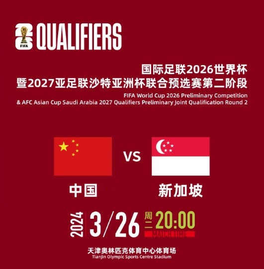 中国足协19日宣布,国足与新加坡队的世预赛主场比赛,将于3月26日20:00开球,比赛地点为天津奥林匹克体育中心体育场(水滴体育场)。