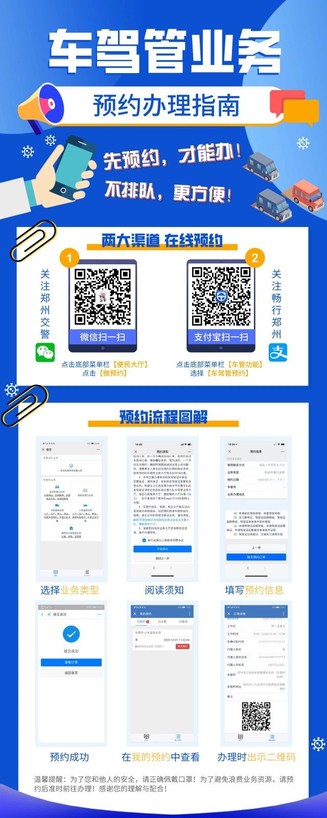 建议需要办理相关业务的车主合理安排时间,先预约、后办理,并在预约办理业务的同时也做好自身疫情防护。