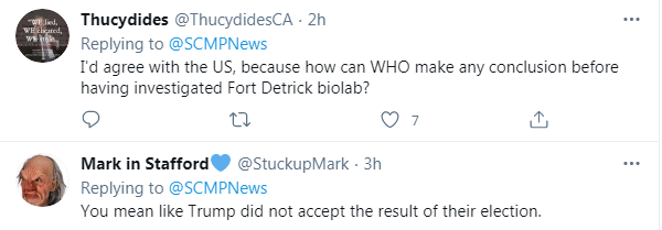 一直遮遮掩掩、拒绝世卫组织专家前来调查的美国居然还好意思提什么“我们需要的必要透明度”,世卫组织专家团的一位荷兰病毒专家直言:“果然开始了,连报告都不愿意等了,对吧?”
