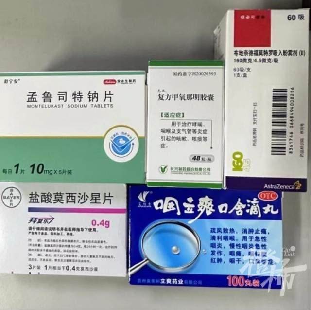 昨天上午,根据戴女士的病史,医生给她做了相关检查。喉咙红肿,血常规和肺部CT检查均正常,肺功能提示“高度嗜酸性气道炎症”,另有过敏性哮喘症状。医生对症开了五种药,包括消炎药、治哮喘药、抗过敏药、激素药和清咽利喉的中成药。