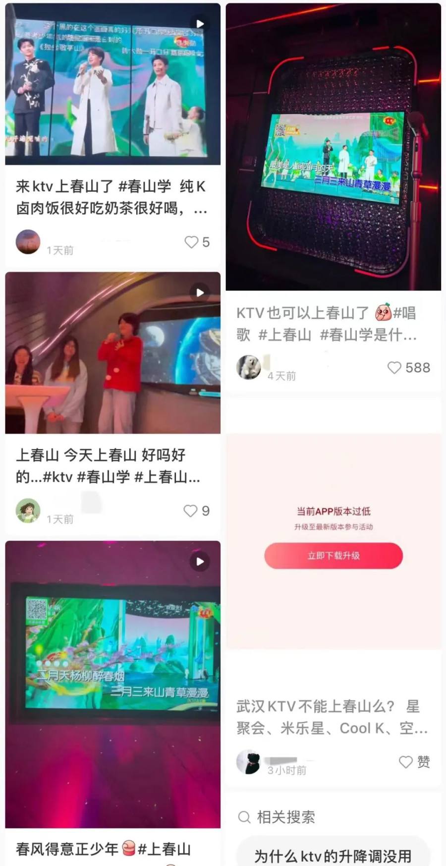 同时,在社交平台上,也可见网友晒出的在KTV演唱《上春山》的视频。而在演唱时,网友们普遍会模仿魏晨、魏大勋、白敬亭三人在春晚演唱《上春山》时的站位和动作。北京多家KTV近日也向记者表示,已经有《上春山》这首歌。