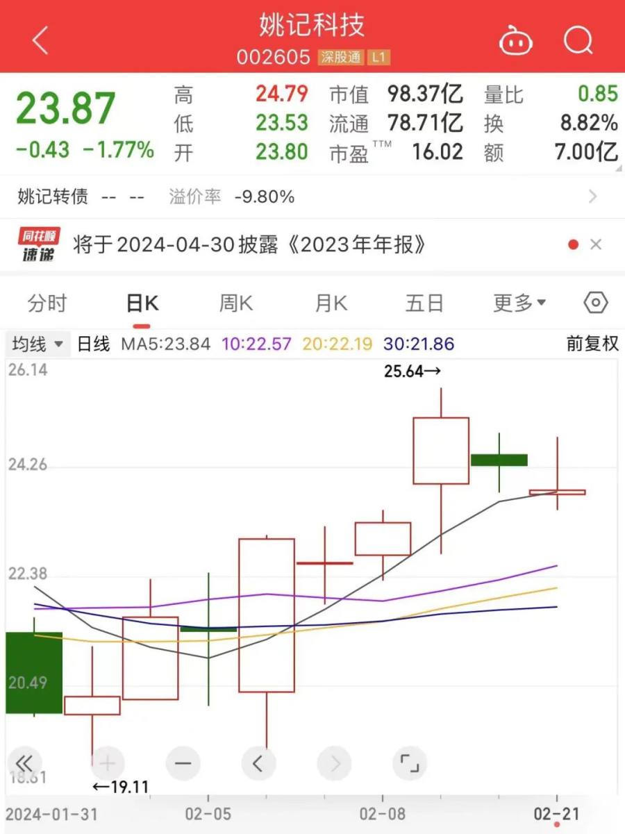 2月19日,A股龙年第一个交易日,姚记科技股价涨超7%。不过到了20日,其股价又下跌超3%。21日,其股价下跌1.77%。
