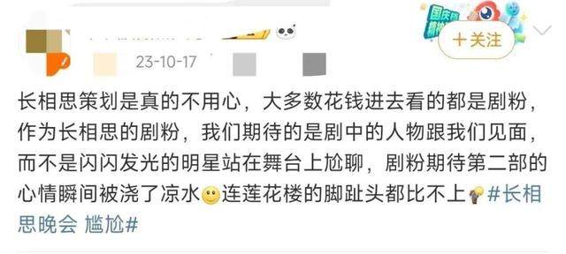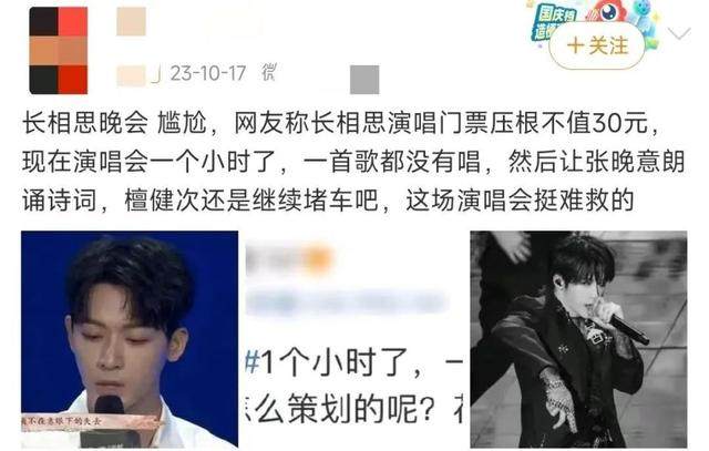 并非所有热门影视项目开演唱会都能收获好评。和《莲花楼》一样,同为2023暑期大剧的《长相思》在同年11月举办了“收官庆典大荒巡礼狂欢夜”。虽未言明是“演唱会”,但粉丝都是带着对“售后演唱会”的期待而来。然而,“潦草”节目安排,将#长相思晚会尴尬#送上了热搜。