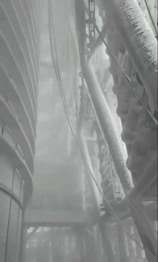 记者在视频中看到,天气阴沉,画面中可视范围不大,建筑及地面都凝满白霜,还能听到类似铲雪的声音。