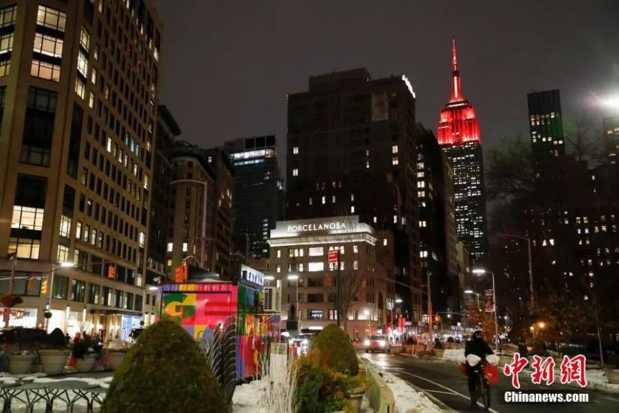 资料图:当地时间2月10日,美国纽约帝国大厦为中国春节点亮红色灯光。当日,在中国驻纽约总领馆的支持和推动下,纽约帝国大厦、世贸中心等地标共同为中国春节亮灯。中新社记者 廖攀 摄