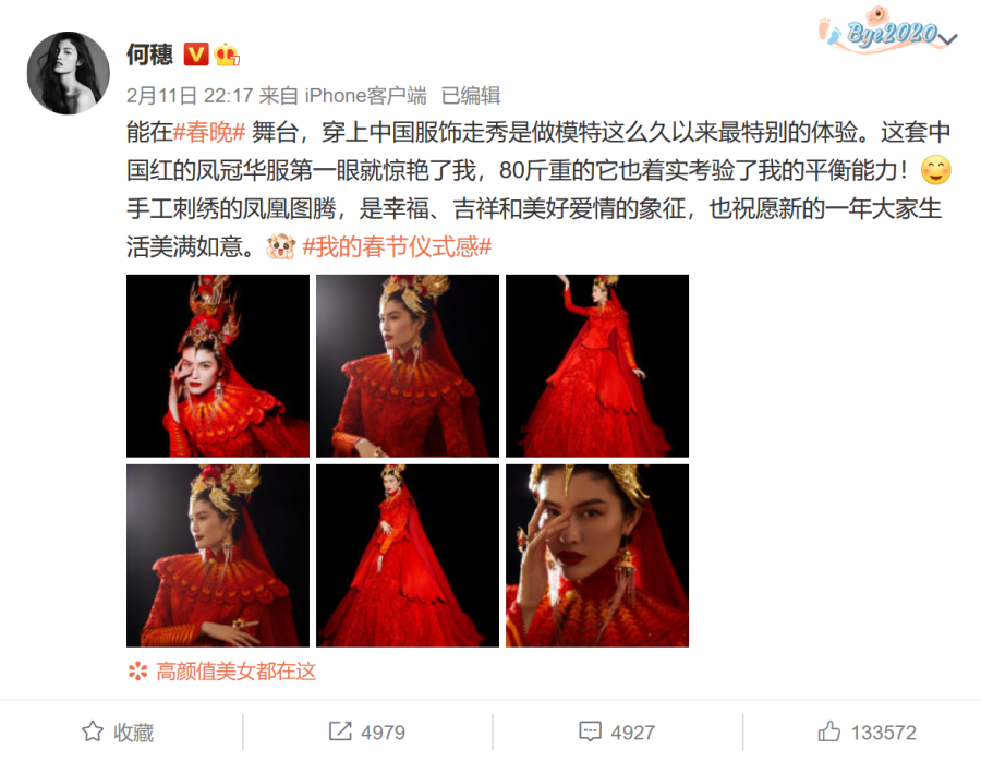模特何穗还发博称:“能在#春晚#舞台,穿上中国服饰走秀,是做模特这么久以来最特别的体验。这套中国红的凤冠华服第一眼就惊艳了我,80斤重的它,也着实考验了我的平衡能力!”