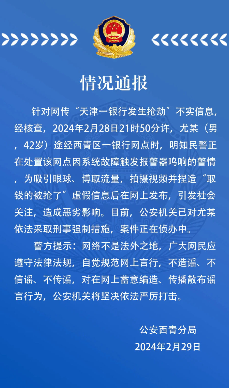 2月29日20时10分,天津市公安局西青分局发布通报称,针对网传“天津一银行发生抢劫”不实信息,经核查,2024年2月28日21时50分许,尤某(男,42岁)途经西青区一银行网点时,明知民警正在处置该网点因系统故障触发报警器鸣响的警情,为吸引眼球、博取流量,拍摄视频并捏造“取钱的被抢了”虚假信息后在网上发布,引发社会关注,造成恶劣影响。