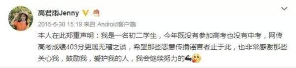 此外,高君雨在中考时也以727分的高分考入名校执信中学。接受记者采访时,高君雨的妈妈李翠霞曾表示,“大家一直关注君雨的成绩,从她初二开始就传说她高考成绩只有403分,但她一直是以阳光心态去面对,这样网上的声音反而变成了动力,她说,我必须要用实际行动来击碎质疑”。
