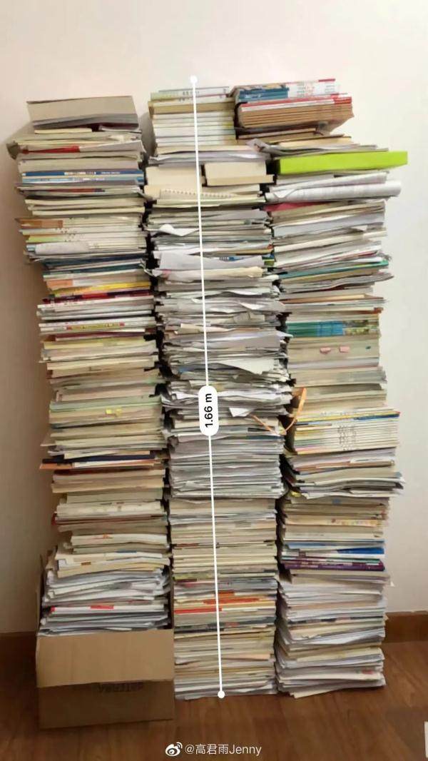 2019年6月9日,她还在微博上晒出自己多年苦学用的课本教材,满满地堆成了一座“小山”↓