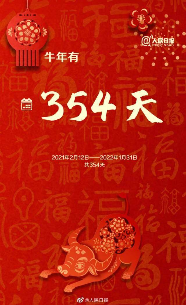 今天,大年初一,牛年来啦!辛丑牛年从2021年2月12日开始至2022年1月31日结束,共354天;牛年没有闰月,是个平年;牛年只有23个节气…这些牛年知识,你都发现了吗?#牛为什么排在十二生肖第二位#?戳图了解↓↓
