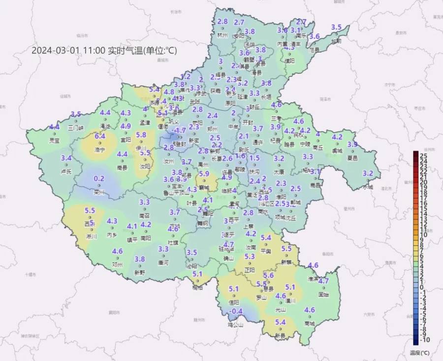 上午11时,大部地区气温仅在2-4度之间