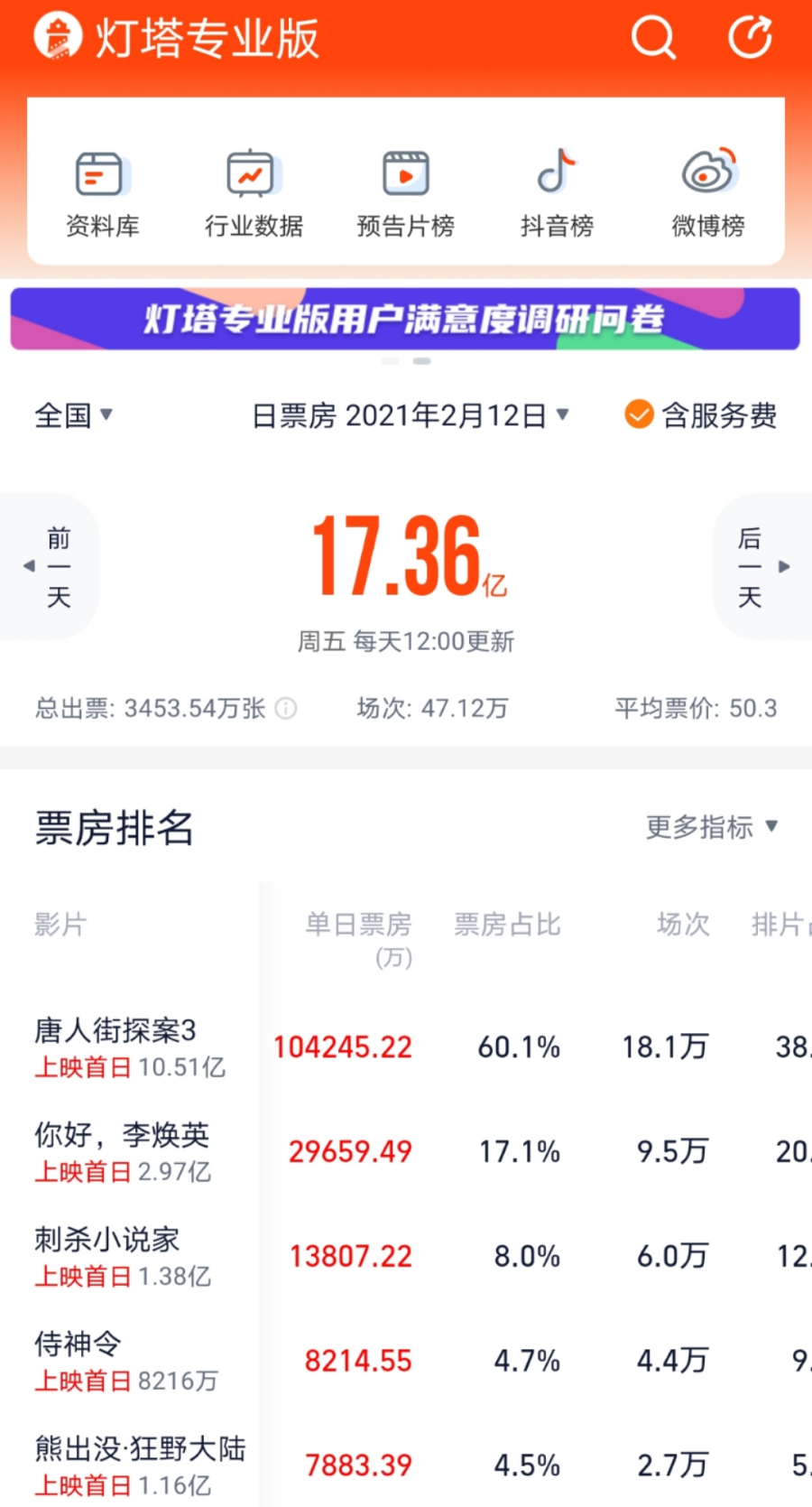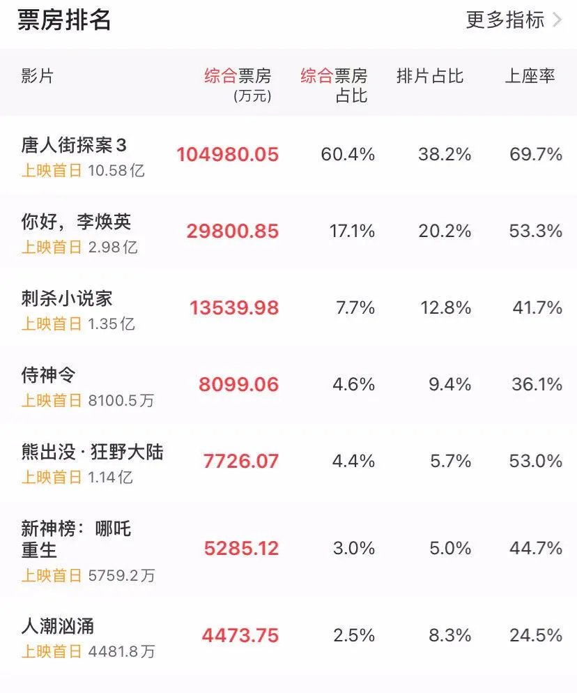 春节档首日,《唐人街探案3》斩获票房10.51亿,遥遥领先。票房贡献率超60%。