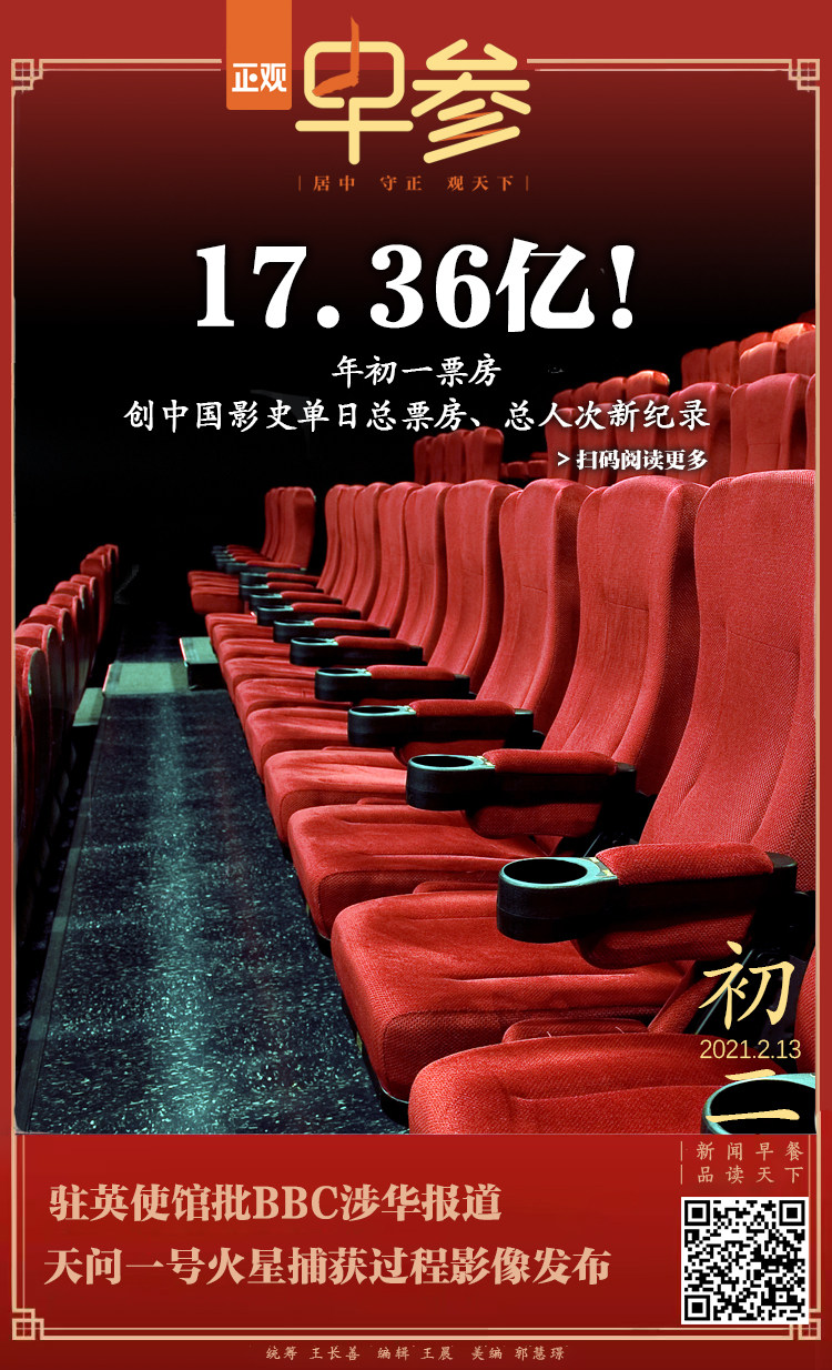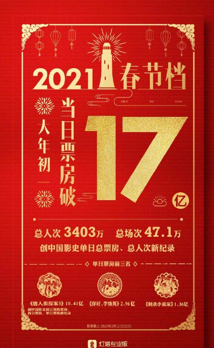 根据灯塔专业版实时数据,截至2月12日晚22时,牛年首日电影票房超过17亿元,总人次3403万,创下中国影史单日总票房、总人次新纪录。《唐人街探案3》、《你好,李焕英》、《刺杀小说家》分列单日票房前三。