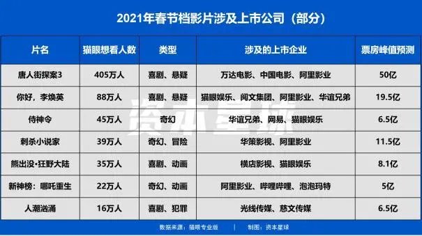 至此,阿里、腾讯、美团、网易等互联网上市公司均出现在今年春节档,猫眼娱乐和哔哩哔哩等本身就和影视业务相关的公司也没有缺席。