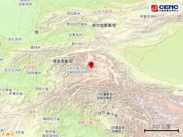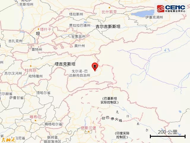 据中国地震台网正式测定,2月13日1时1分在塔吉克斯坦发生6.1级地震,震源深度100千米,震中位于北纬38.15度,东经73.55度,距我国边境线最近约54公里。