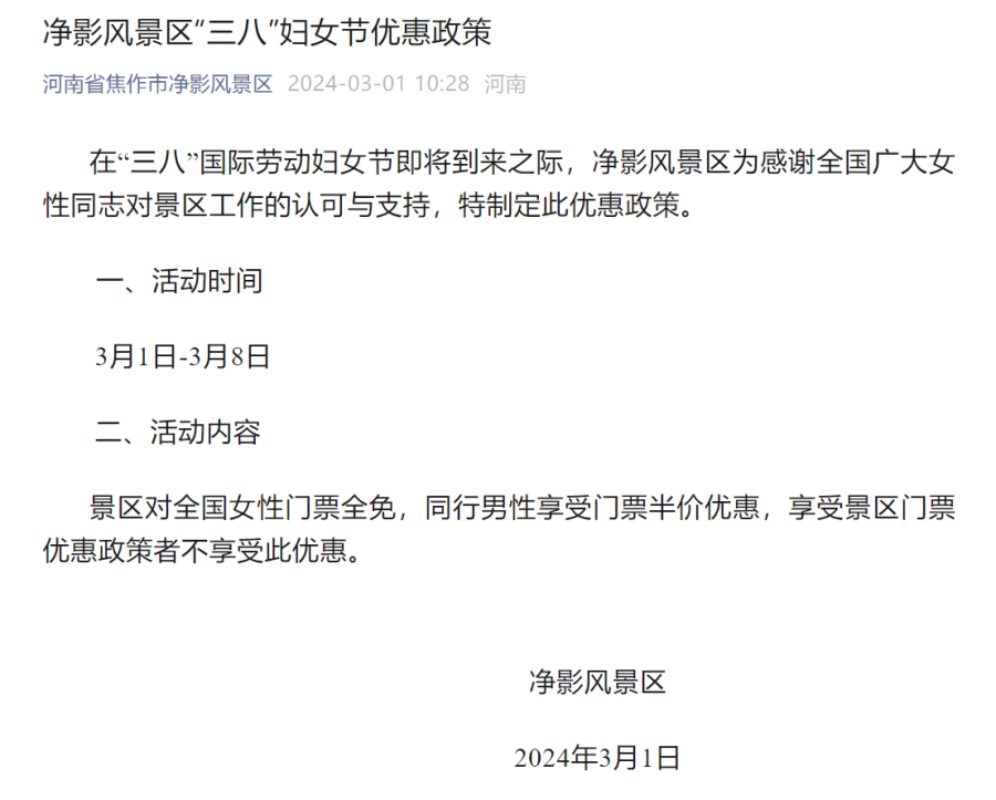 “三八”妇女节将至,河南安阳、新乡、焦作、信阳等地景区推出优惠政策,女性免门票、同行男性半价!