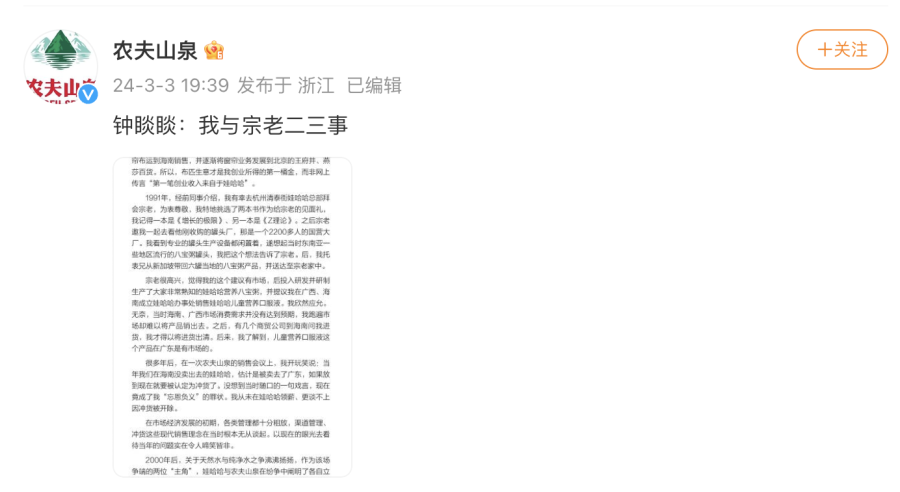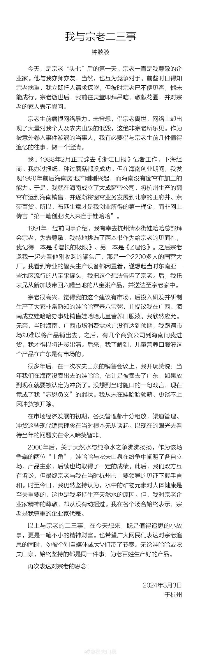 3月3日,@农夫山泉发布了《钟睒睒:我与宗老二三事》,钟睒睒回忆了他与宗庆后之间的一些事情,他表示,“宗老生前痛恨网络暴力。未曾想,借宗老离世,网络上却出现了大量对我个人及农夫山泉的诋毁,这绝非宗老所乐见。”