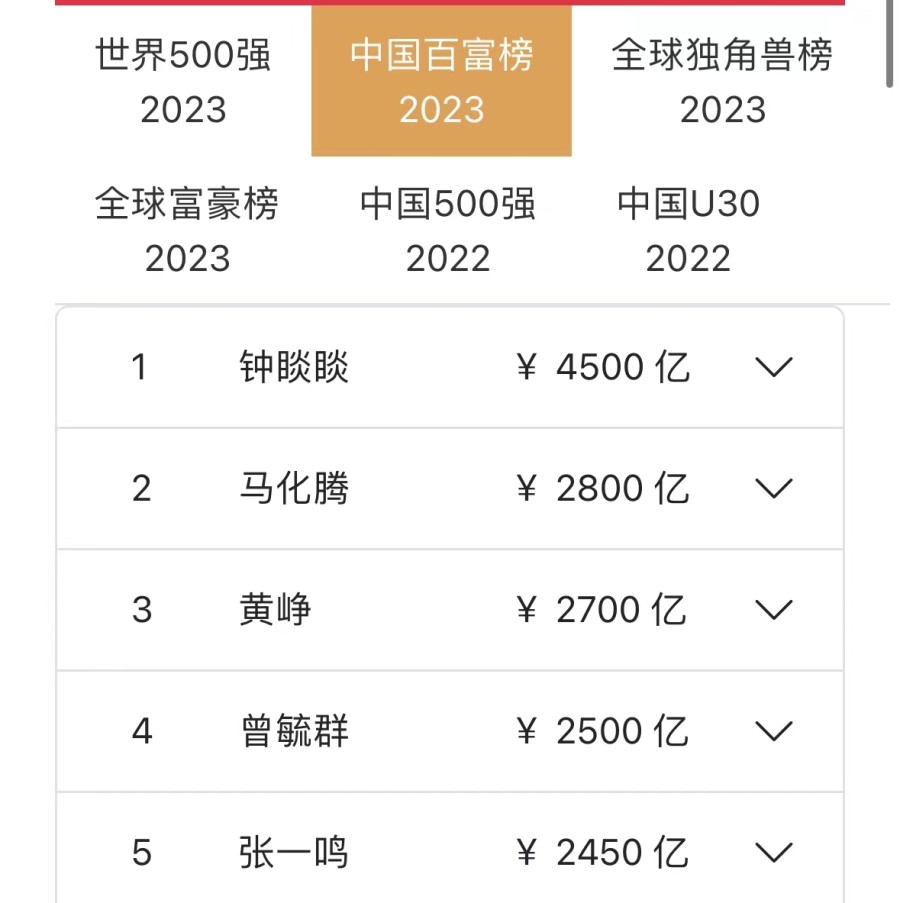 据《2023衡昌烧坊·胡润百富榜》显示,农夫山泉69岁的钟睒睒财富基本与上一年持平,以4500亿元第三次成为中国首富。