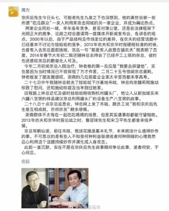 另外,据国是直通车,农夫山泉副总周力博士朋友圈近日发文回应“捧‘娃哈哈’踩‘农夫山泉’风波”。周力表示,宗庆后先生今日头七,可能老先生九泉之下也没想到,他的离世会被一些所谓“吃瓜群众”一类人利用来攻击同城的另一家企业,并成为舆论热点。两家企业同处一城,早年虽有竞争,甚至对薄公堂,还是在法律框架下光明正大的竞争。