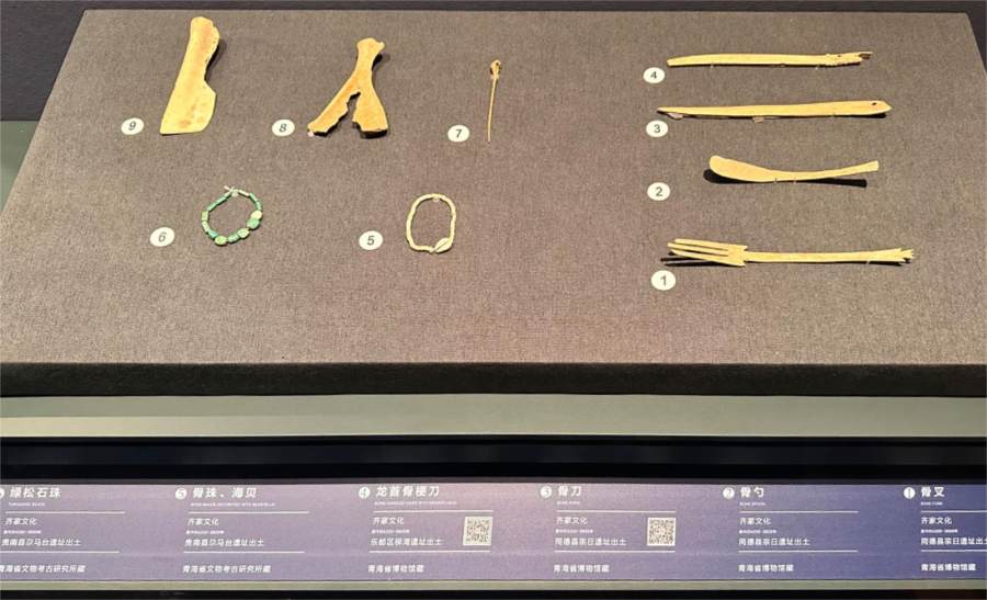 “这件研磨器,它距今大约有6700年的历史,是远古先民加工食物的用具。”“我们眼前是一组骨质的餐具,骨叉、骨勺和骨刀。在今天看来这是西餐用具,其实早在4000多年前,远古先民早已用它作为用餐的餐具……”青海省博物馆社会教育部孙丽宁清亮透彻的讲解声音传来。
