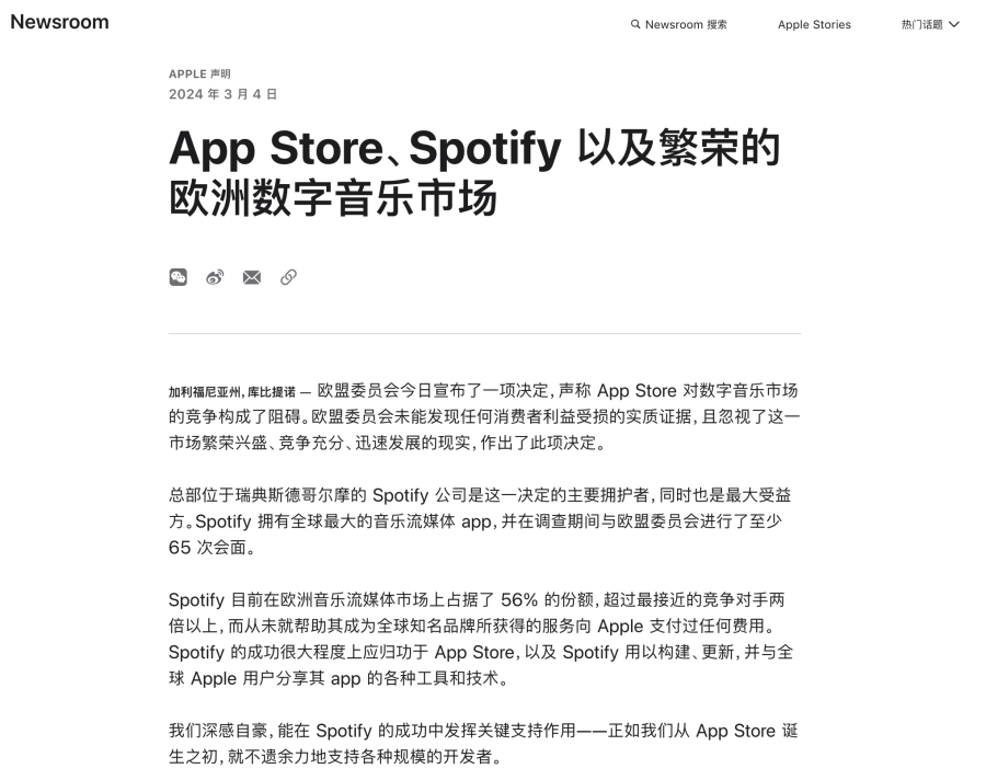 3月4日,苹果公司在其官网发布的一篇声明中称,总部位于瑞典斯德哥尔摩的Spotify公司是这一决定的主要拥护者,同时也是最大受益方。Spotify拥有全球最大的音乐流媒体app,并在调查期间与欧盟委员会进行了至少65次会面。