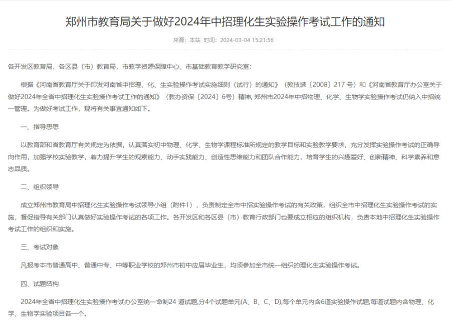 3月4日,郑州市教育局发布通知,2024年郑州市理化生实验操作考试时间统一为2024年4月1日至24日。每位考生的考试时间为15分钟。凡报考郑州市普通高中、普通中专、中等职业学校的郑州市初中应届毕业生,均须参加全市统一组织的理化生实验操作考试。