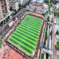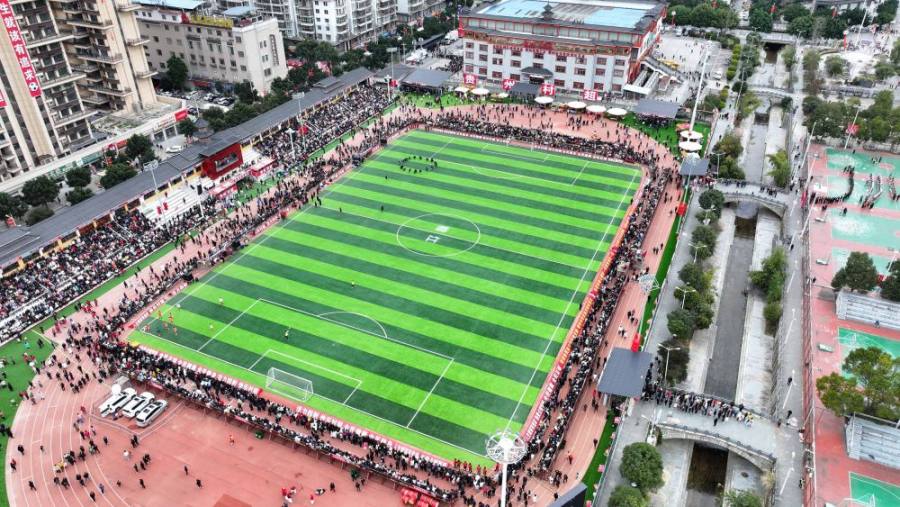 2月3日,观众在“村超”赛场等待活动开始(无人机照片)。新华社记者 刘续 摄