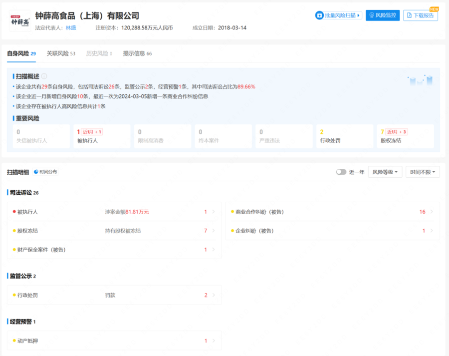 此外,据中国执行信息公开网消息,钟薛高食品(上海)有限公司近日新增一则被执行人信息,执行标的818106元,立案时间为2024年2月19日,案号为(2024)沪0114执2012号,执行法院为上海市嘉定区人民法院。