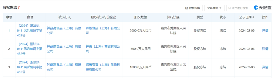 天眼查信息显示,钟薛高食品(上海)有限公司于近日新增3则股权冻结信息,此次股权被执行的企业为钟薛高旗下三家公司。天眼查信息显示,殊趣食品(上海)有限公司、盘箸有喜(上海)生物科技有限公司、钟嘉(上海)商贸有限公司,均为钟薛高旗下100%控股公司,股权冻结数额分别为2000万元、1000万元和500万元。此次股权的冻结期限直至2027年2月5日,执行法院为浙江嘉兴市秀洲区人民法院。