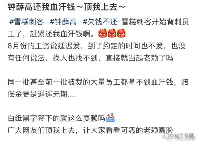值得注意的是,去年10月,钟薛高曾因“欠薪”登上热搜榜。多位自称钟薛高员工的网友在社交媒体爆料称被拖欠工资。