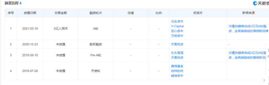 2018年7月,钟薛高获得真格基金、登布苏投资、峰瑞资本的天使轮投资;当年8月又获得由头头是道投资基金、天图投资参与的Pre-A轮融资;2020年12月,天图投资追加了一次股权融资;2021年5月,钟薛高完成了2亿元的A轮融资,由元生资本领投,H Capital、万物资本跟投。此后,钟薛高再未有新的融资进入。