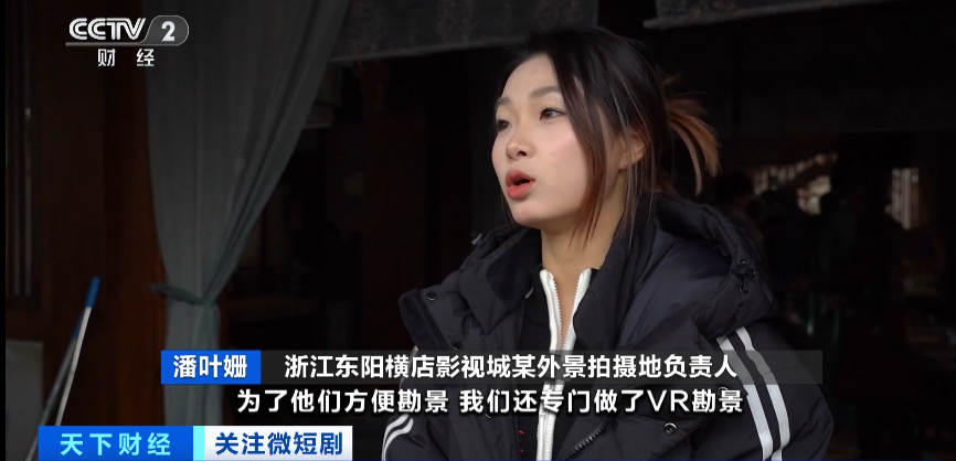 浙江东阳横店影视城某外景拍摄地负责人 潘叶姗:一天最多接待过六七个微短剧组,道具都弄好,可以节省他们的成本。我们有皇宫大殿、府邸大厅、客栈、牢房等场景。为了方便,我们还专门做了VR勘景。